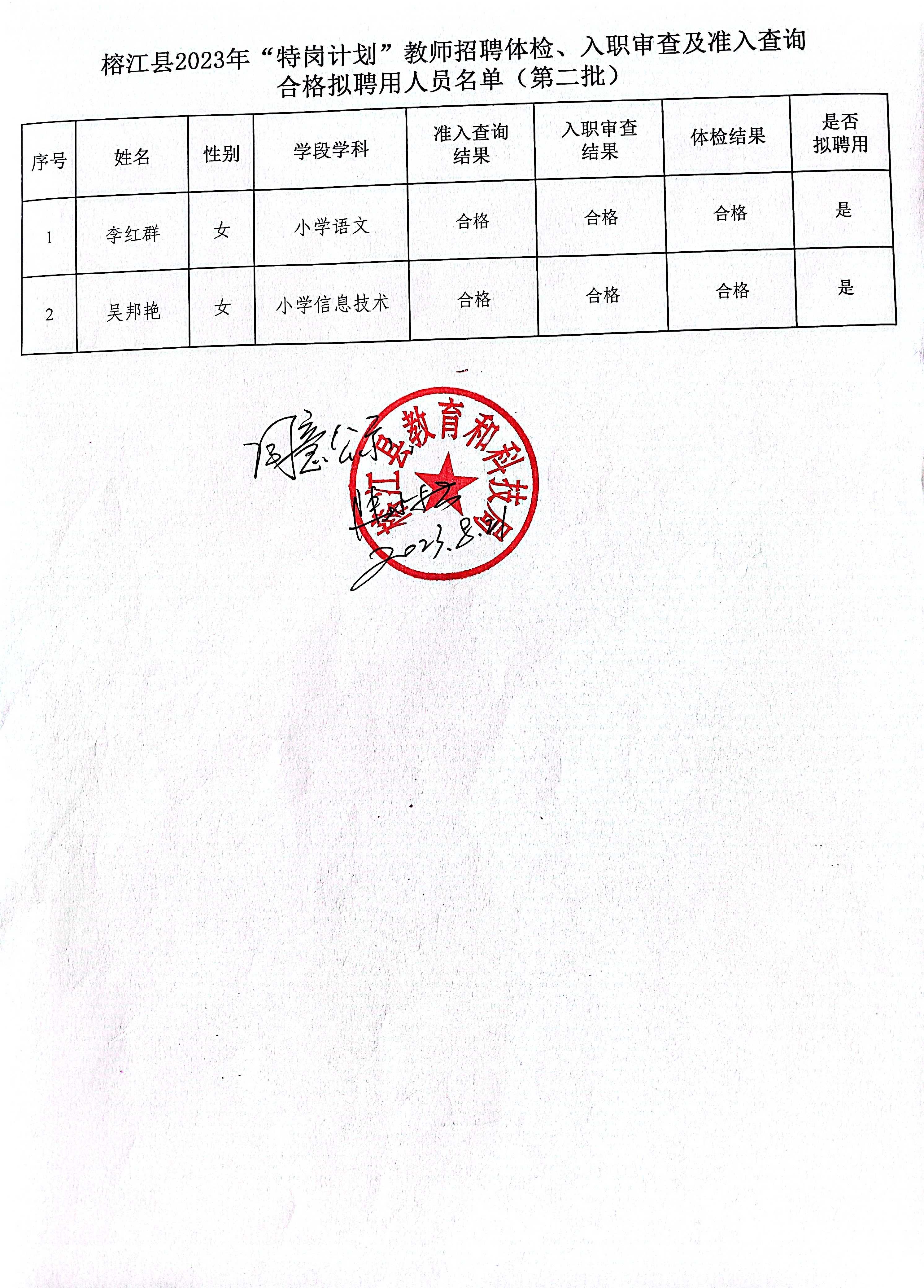 原文標(biāo)題:榕江縣2023年“特崗計劃“教師招聘體檢、入職審查及準入查詢合格擬聘用人員名單公示(第二批2人)